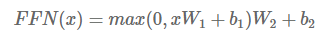 position 마다, 즉 개별 단어마다 적용되기 때문에 position-wise이다. network는 두 번의 linear transformation과 activation function ReLU로 이루어져 있다.