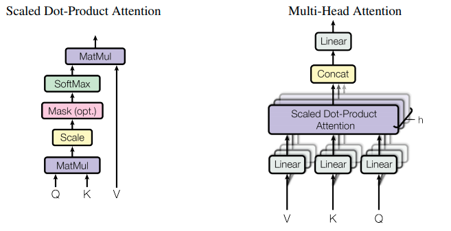 모든 query과 key에 대해 dot-product를 계산하고 각각을 scaling 하여 scaled dot-product attention값을 구한다. 여기에 softmax를 적용해 value들에 대한 weights를 얻어낸다. (scaling를 해주는 이유는 dot-products 값이 커질수록 softmax 함수의 기울기 변화가 거의 없기 때문이다.)